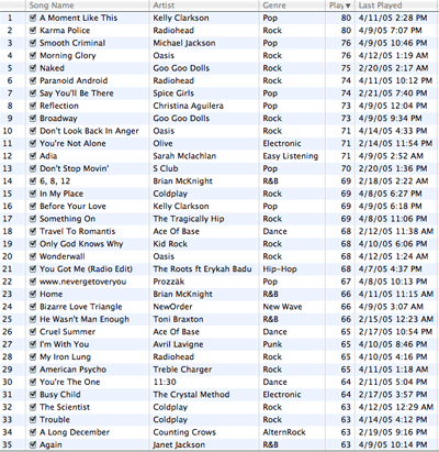 anyways, while audioscrobbler is cool, it only started collection statistics since i’ve started using it. so it’s missing oh, a couple years of good music listening. awhile back, i posted my most listened to tracks through itunes so lets see what’s changed in the 8 months or so since.