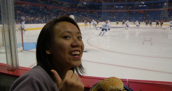 For Pauline’s Birthday, I took her a Leafs game. Ok, so it was in Buffalo, and it was only pre-season; but on the plus side, we didn’t have to spend the downpayment for our home on it! Actually it was really awesome, because I got rinkside tickets, which meant that when someone came down the wing and shot at the net (especially the prospects), it was an OH SHIT DUCK moment. Here’s our view: