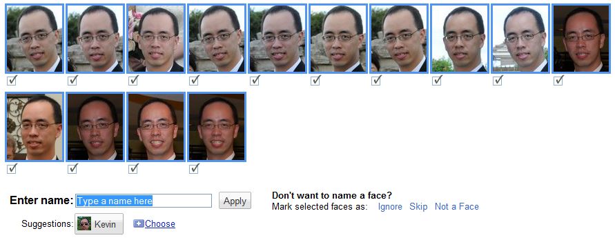 One of the new features for Picasa (Web Albums) is Name Tags (enable it under Settings), which is like face tagging on Facebook. The innovation here is that instead of having to click each face, Google scans all your photos, detects faces, and clusters them together so you can tag all instances of the person’s face at once. For example, I can tag all of me at once: