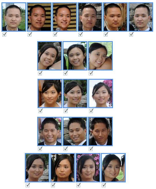Presumably, Picasa will be able to infer, once I’ve tagged my face as Kevin, that future faces that look like me is probably me, and will suggest that I tag them with “Kevin”. Does that make sense? Anyways, it’s much quicker than Facebook. Pretty cool right? It’s actually much cooler than it looks because it can handle rotations, slight changes in depth, and partial faces. Here’s some other samples (each row is a separate cluster):