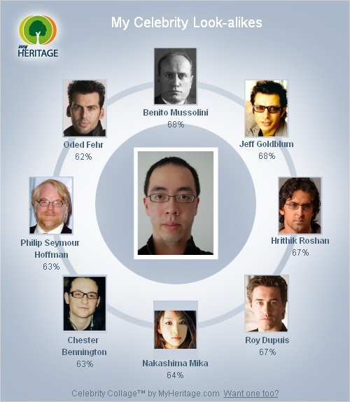 So Mussolini and Jeff Goldblum, I guess the software somewhat works but there are no celebrities that are a great match for me. Plus, aside from those two and Philip Seymour Hoffman, I haven’t even heard of the rest. Although, it seems cool that I look like ROSHAN.